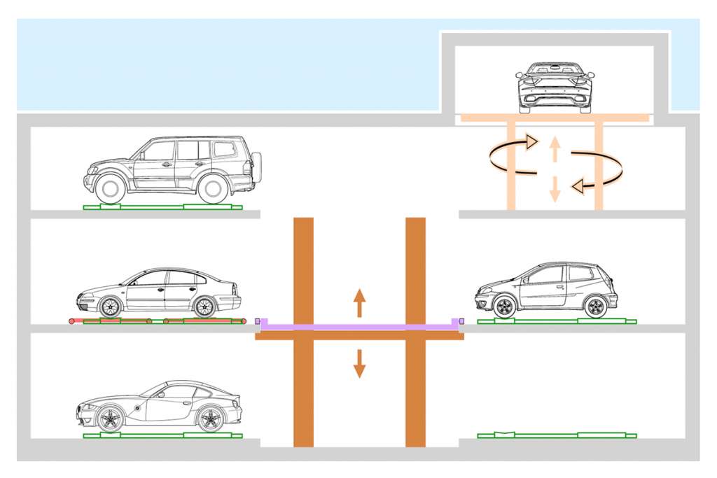 Le auto sono parcheggiate su stalli fissi (equipaggiamenti verdi nello schema). Un carrello - shuttle - (equipaggiamento blu) si sposta orizzontalmente su ogni piano, si posiziona di fronte allo stallo con l’auto da recuperare, trasferisce l’auto con il carrellino a sollevamento integrale (equipaggiamento rosso) dallo stallo allo shuttle stesso, si sposta sopra l’elevatore (equipaggiamento marrone) e sale fino al locale di uscita. L’utente può così salire a bordo dell’auto e uscire dal parcheggio. Il sistema è pronto per una nuova operazione (rispetto alla tipologia a pianale si ha un abbattimento dei tempi ciclo perché non occorre attendere il tempo di riposizionamento del pianale vuoto nello stallo di parcamento). L’operazione di parcheggio è uguale a fasi invertite.
